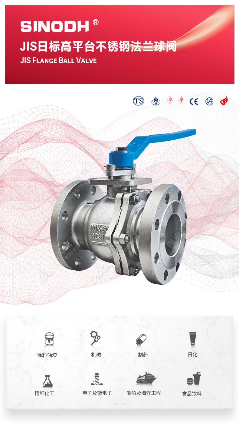 JIS日标高平台不锈钢法兰球阀,为FH手机平台自主研发生产本产品设计制造标准符合J1 SB2071标准,该产品的球体(密封件)是浮动的,在介质压力作用下,球体能产生-定的位移并紧压在出口端的密封面上,保证出口端密封。适用于水、溶剂、酸和天然气等一般工业介质,也适用于工况恶劣的介质,如氧气、过氧化氢、乙烯等介质。